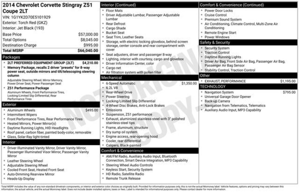 BMW of Tuscaloosa presents this 2014 Chevrolet Corvette Stingray Z51 in Torch Red exterior with Jet Black interior. The Vehicle is equipped with Memory Package, Preferred Equipment Group 2LT (2LT Interior Trim, Auto-Dimming Inside Frameless Rearview Mirror, Body-Color Outside Heated Power-Adjustable Mirrors, Cargo Net, Head-Up Display, Heated & Vented Driver & Passenger Seats, Luggage Shade, Power Lumbar/Bolster Seat Adjusters, Radio: Chevrolet MyLink AM/FM Stereo, Theft Deterrent System, and Universal Home Remote), 2.73 Limited Slip Performance Rear Axle Ratio, 4-Wheel Disc Brakes, 8-Way Driver & Passenger Seat Adjusters, 9 Speakers, ABS brakes, Air Conditioning, Alloy wheels, AM/FM radio: SiriusXM, Automatic temperature control, Bose Premium 9-Speaker Audio System Feature, Bumpers: body-color, Compass, Delay-off headlights, Driver door bin, Driver vanity mirror, Dual front impact airbags, Dual front side impact airbags, Electronic Stability Control, Emergency communication system: OnStar Directions & Connections, Exterior Parking Camera Rear, Four wheel independent suspension, Front anti-roll bar, Front Bucket Seats, Front Center Armrest, Front dual zone A/C, Front reading lights, Fully automatic headlights, GT Bucket Seats, Heated door mirrors, High-Intensity Discharge Headlights, Illuminated entry, Leather Shift Knob, Leather steering wheel, Low tire pressure warning, Mulan Perforated Leather Seating Surfaces, Navigation System, Occupant sensing airbag, Outside temperature display, Painted Body-Color Carbon Fiber Removable Roof Panel, Panic alarm, Passenger door bin, Passenger vanity mirror, Performance Exhaust, Power door mirrors, Power driver seat, Power passenger seat, Power steering, Power windows, Premium audio system: Chevrolet MyLink, Radio data system, Rear anti-roll bar, Rear window defroster, Remote keyless entry, Remote Vehicle Starter System, SiriusXM Satellite Radio, Speed control, Speed-sensing steering, Spoiler, Sport steering wheel, Steering wheel mounted audio controls, Tachometer, Telescoping steering wheel, Tilt steering wheel, Traction control, Trip computer, Variably intermittent wipers, Voltmeter, Wheels: 19" x 8.5" Fr & 20" x 10" Rr 5-Split Spoke, and Wheels: 19" x 8.5" Fr & 20" x 10" Rr Black Alum..