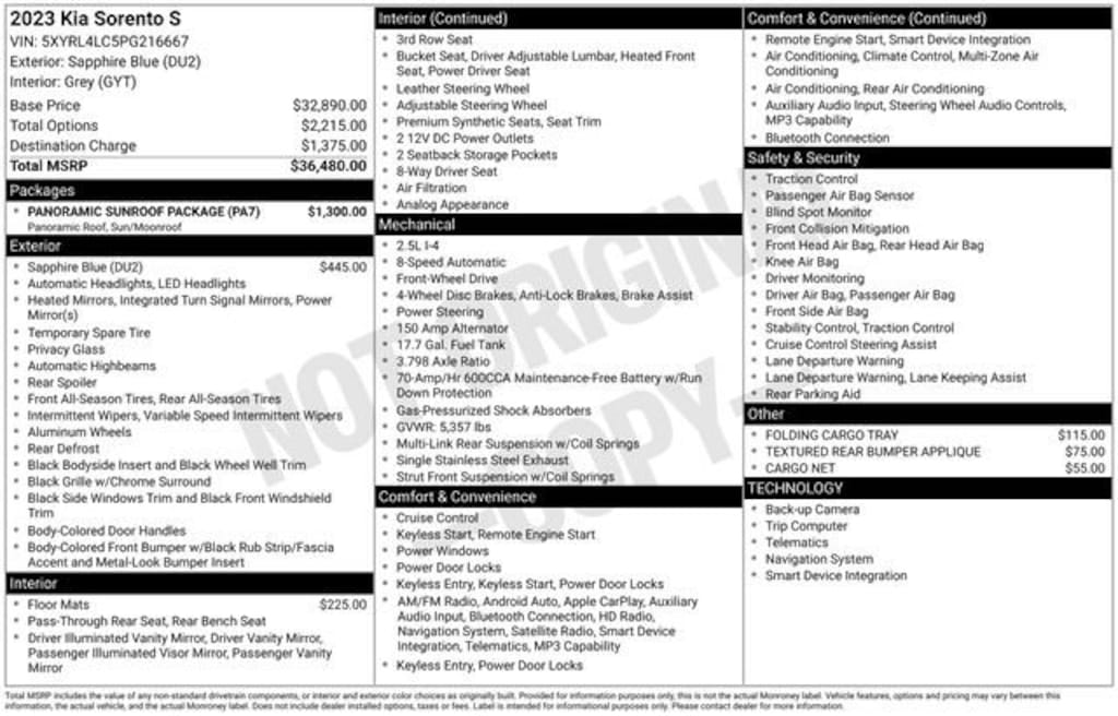 Experience the exceptional value and capabilities of the 2023 Kia Sorento S. Visit our showroom today and let us demonstrate how this remarkable SUV can elevate your driving experience. We're confident you'll be impressed by its combination of style, performance, and cutting-edge features.