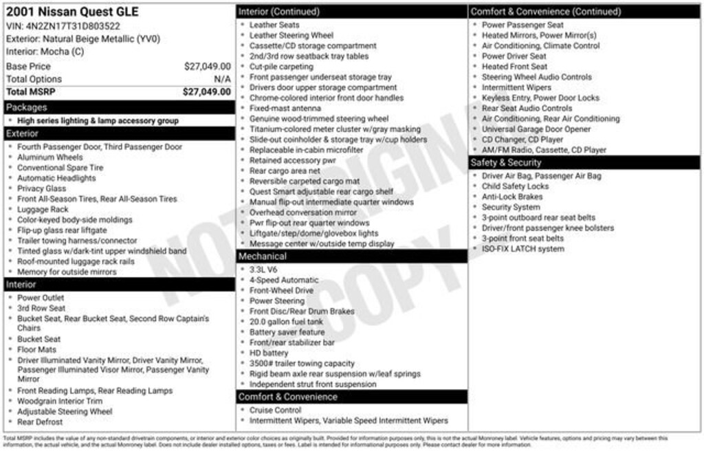 It just arrived on our lot this past week! This 7 passenger van provides exceptional value! Nissan infused the interior with top shelf amenities, such as: power door mirrors and heated door mirrors, a roof rack, and leather upholstery. It features an automatic transmission, front-wheel drive, and a 3.3 liter 6 cylinder engine.