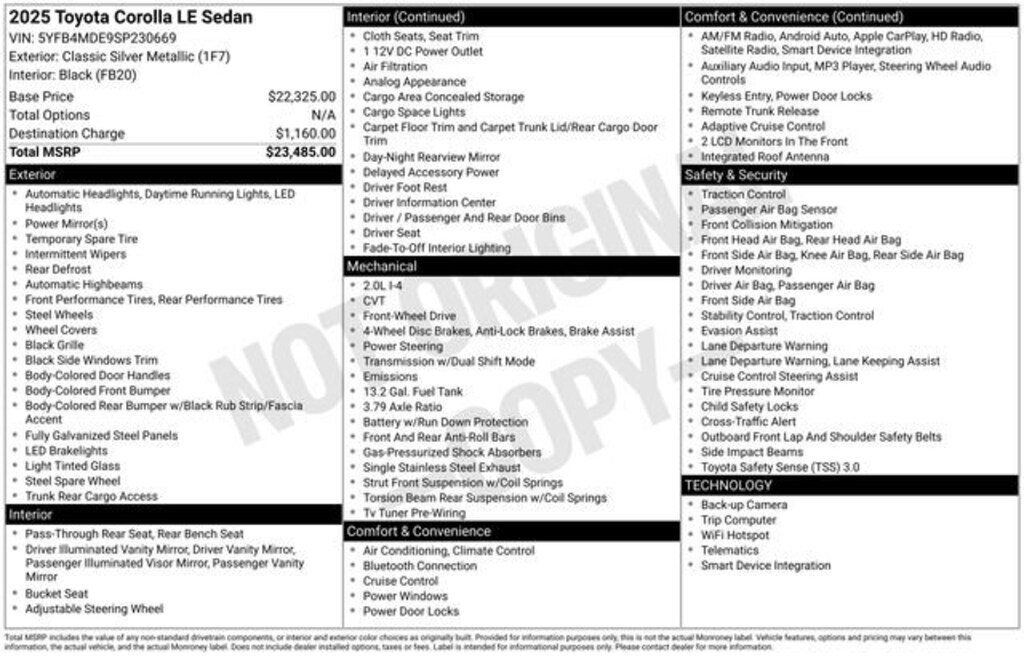 Elevate your driving experience with the remarkable 2025 Toyota Corolla LE. This meticulously engineered sedan boasts a striking silver exterior, complemented by a spacious and well-appointed interior that caters to your every need. Powered by a 2.0L I4 DOHC 16V engine and equipped with a seamless CVT transmission, the Corolla LE delivers an exceptional balance of performance and efficiency, with an impressive 32 city and 41 highway MPG.